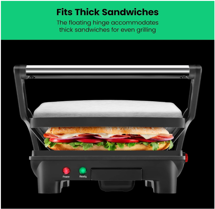 ADJUSTABLE FOR ANY OCCASION: Floating hinge adjusts to accommodate any size sandwich – thick or thin. The closed cooking surface is ideal for four sandwiches or two large paninis. Great for a quick meal, summer party or a family event. This unit is perfect for making breakfast, lunch, dinner and more!