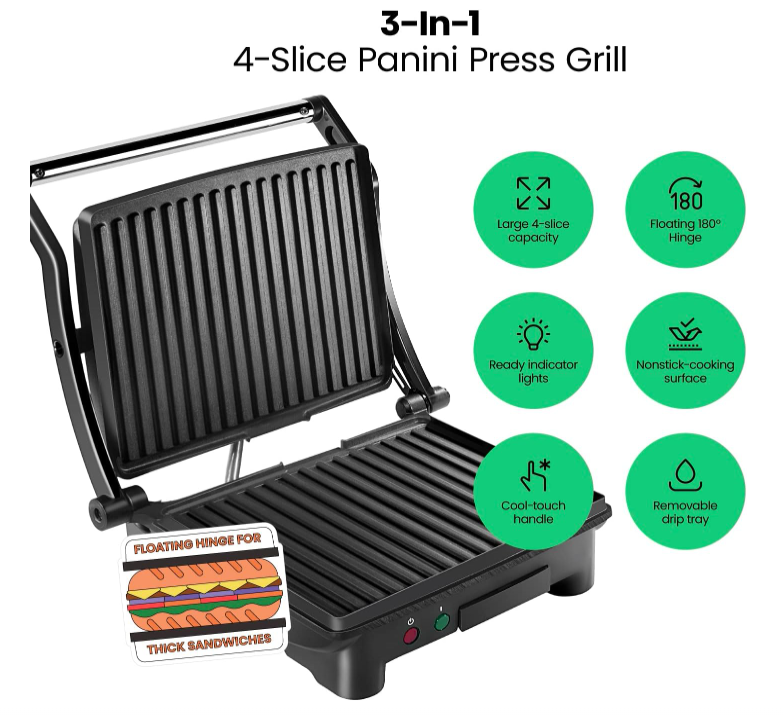 HUNGRY FOR A SANDWICH? With just the push of a button, this 4 Slice Grill-Panini Press Combo can be used to press your custom sandwich or open at 180 degrees for grilling burgers, steaks, veggies and anything else you’re craving quickly and easily! Use it as a panini press for perfectly crisped bread- no cooking spray required.