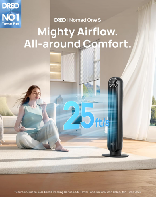 Powerful Meets Portable: Dreo standing fan's all-in-one airflow system combines with a supercharged electric motor, delivering high-speed, brisk cool. This 36-inch compact tower fan exhilarates every inch of air in your living space moving air up to 24ft/s.