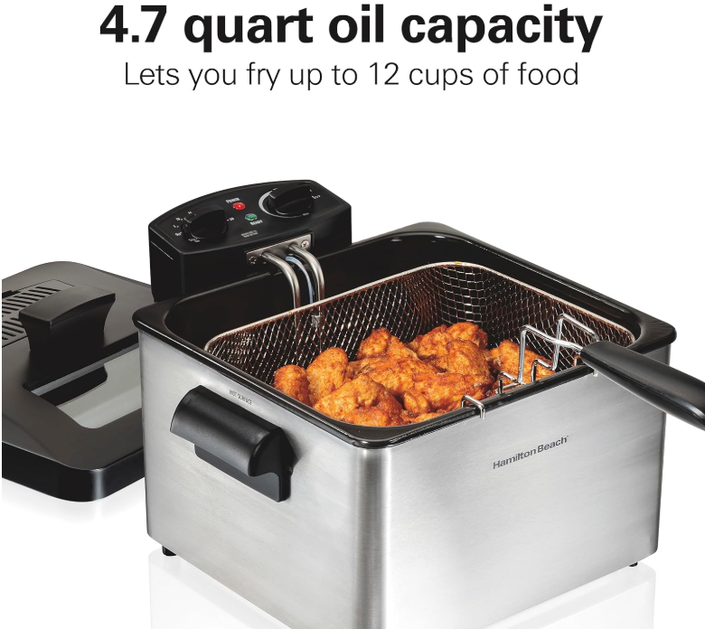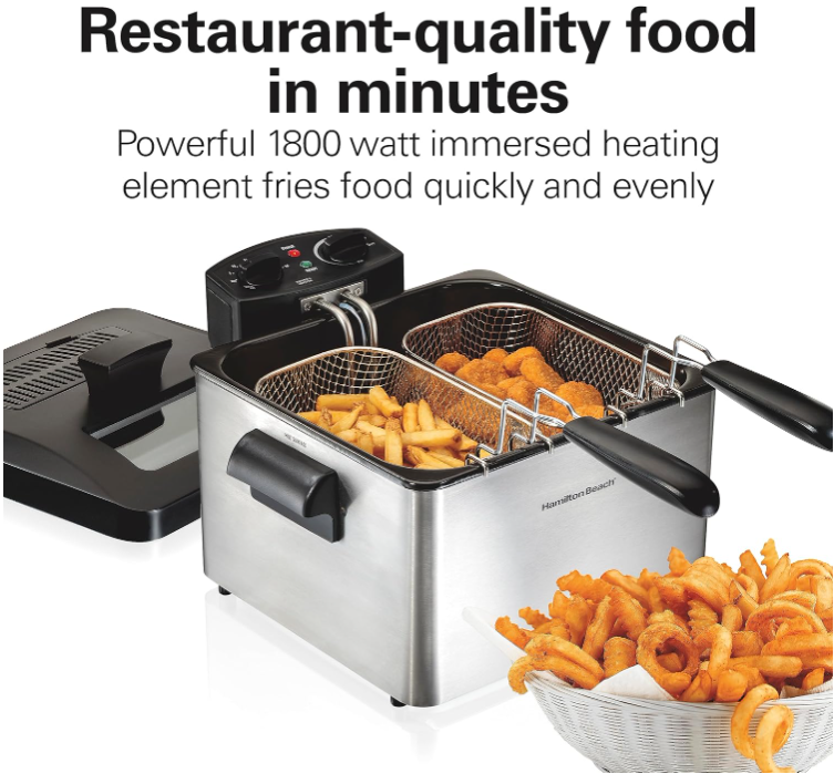 Hamilton Beach Electric Deep Fryer with 3 Baskets and Lid, 4.5 Liters / 19 Cups Oil Capacity, Temperature Control, View Window, Professional Style, 1800 Watts, Stainless Steel (35034)