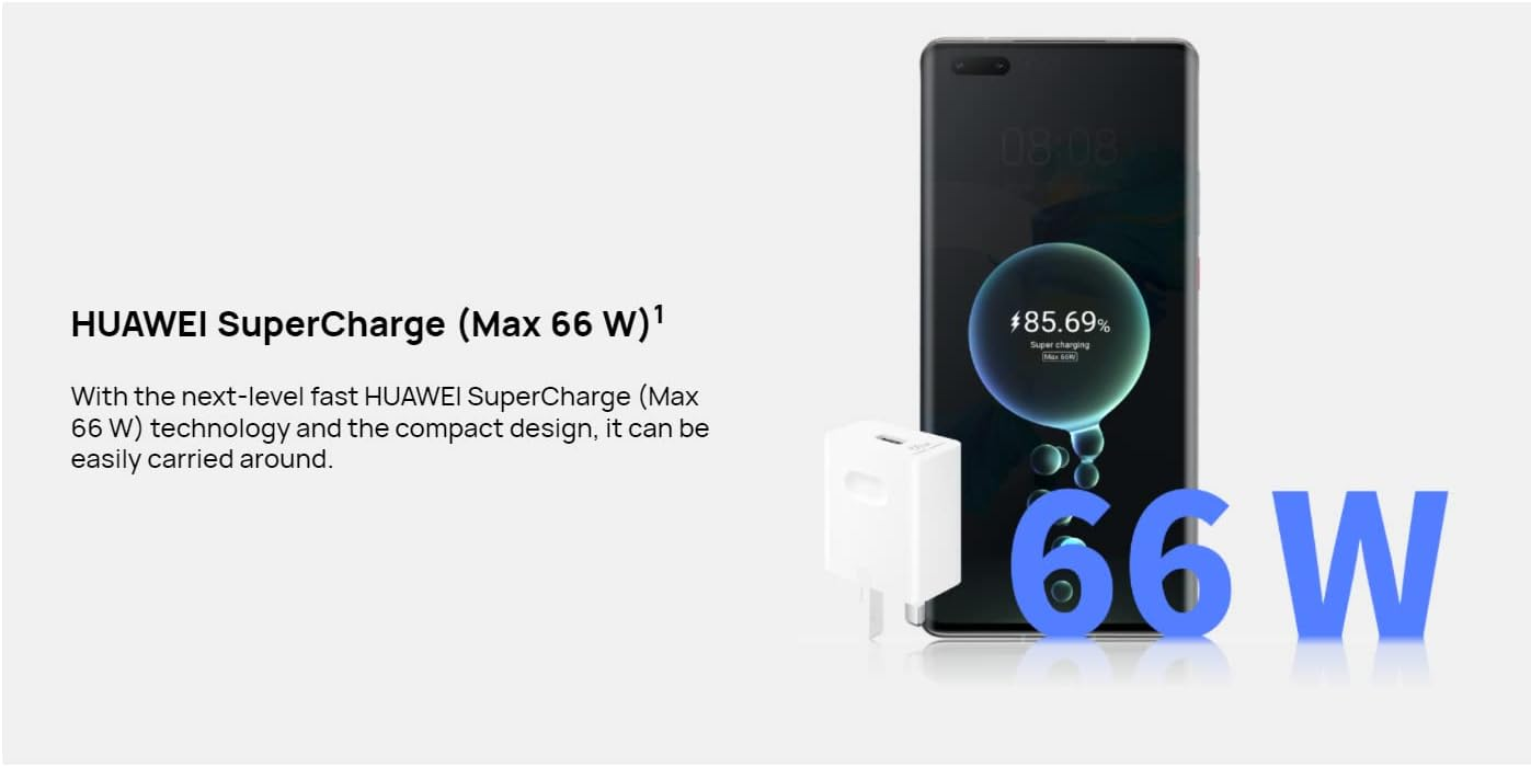 • With the next-level fast HUAWEI SuperCharge (Max 66 W) technology and the compact design, it can be easily carried around.