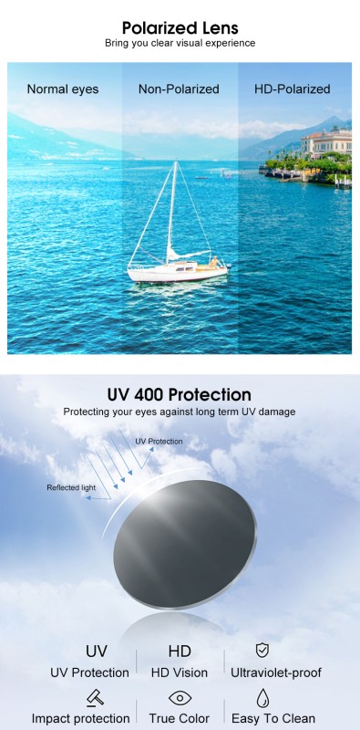 •Polarized UV400 Protection: This sunglasses offer UV Protection filtering of UVA, UVB, UVC and harmful light, clarity & protection against impact and ultraviolet radiation.