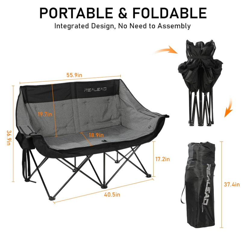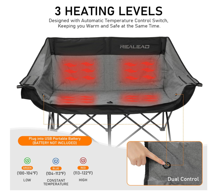 REALEAD Heated Double Camping Chair, 3 Heat Levels and 4 Heating Zones, Portable Heated Loveseat Chair for Outdoor Sports Support 650lbs, Heating Folding Chairs for Outside, Battery NOT Included