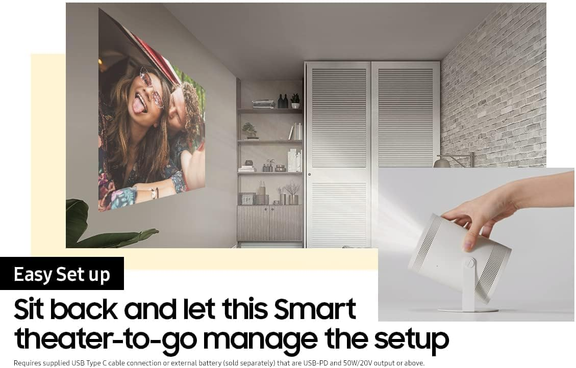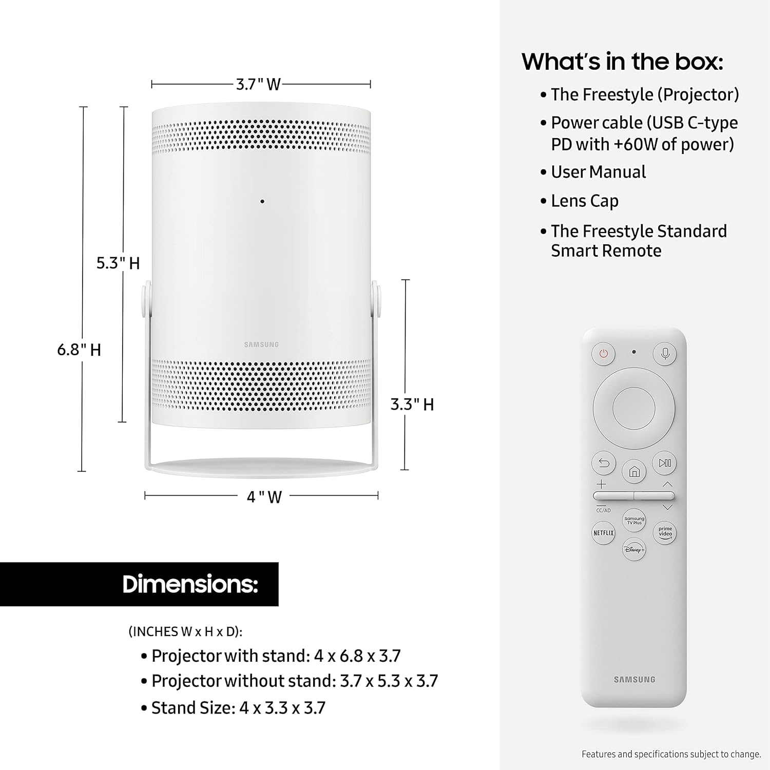 POINT AND PLAY: Place it, tilt it and watch it wherever—this versatile smart theater-to-go makes it simple; With a cradle stand that rotates almost 180 degrees, position your image where you want from floor to ceiling; The Freestyle gives you the flexibility to watch your way.Sound Output (RMS) : 5W. Bluetooth Version : Bluetooth 5.2.Operating System : Tizen. Standby Power Consumption : 0.5W